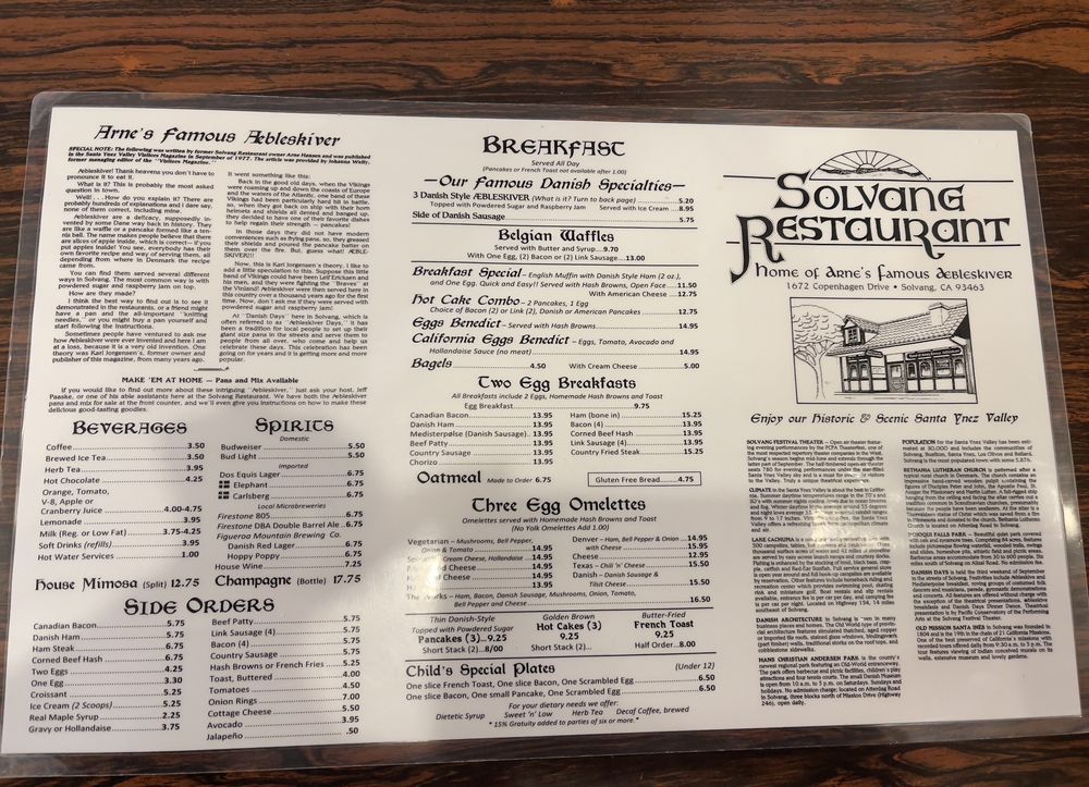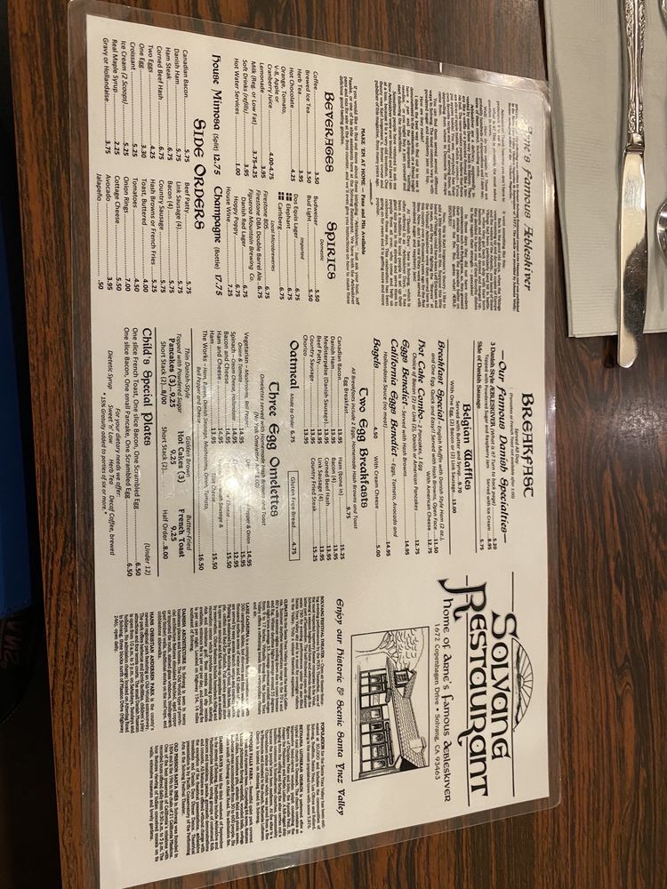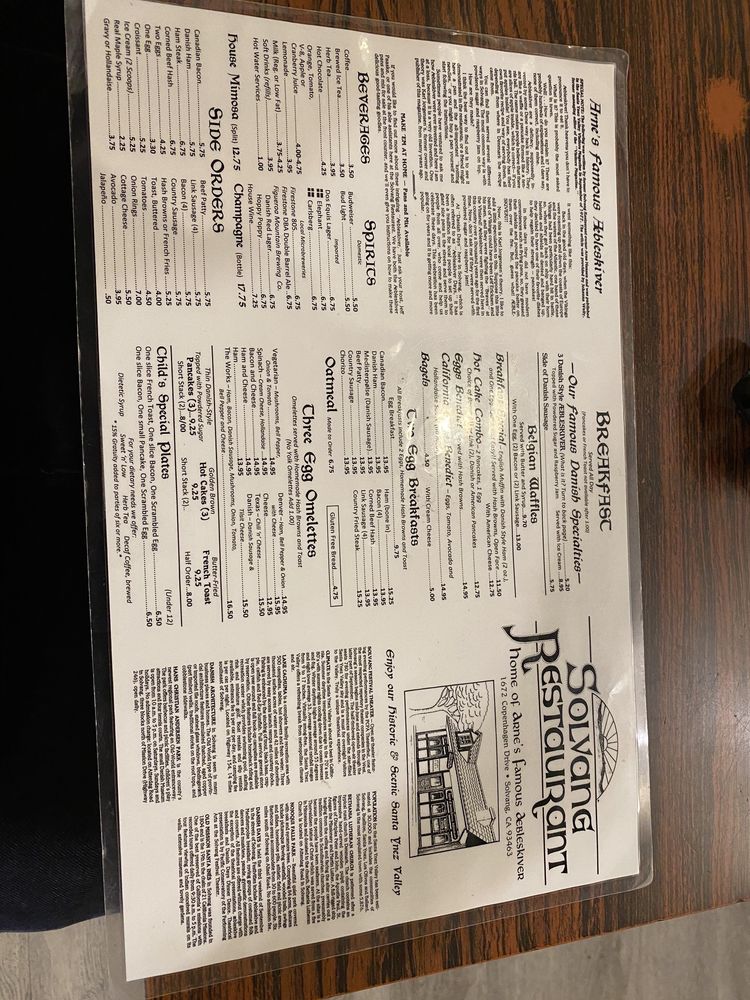 Solvang Restaurant, a Scandinavian-American gem located in Solvang, California, offers a unique blend of traditional Danish dishes and American favorites for breakfast and brunch. The restaurant provides a range of amenities including takeout, reservations, delivery, vegan options, and wheelchair accessibility. Customers rave about the light and airy aebleskiver with jam and powdered sugar, perfect for a quick snack. The friendly staff and quick service enhance the dining experience, making it a popular choice for locals and tourists alike. With a diverse menu featuring Danish specialties like the danish dip and aebleskiver, Solvang Restaurant is a must-visit for those looking to savor the flavors of Solvang in a casual yet charming setting. Whether you're seeking a leisurely brunch or a quick bite, Solvang Restaurant combines delicious food with efficient service for a memorable dining experience.